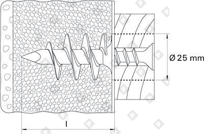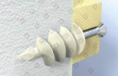 Описание и особенности: Материалом для дюбеля является нейлон. Форма изделия это острый саморез диаметром 25 мм при длине 50, на наружной поверхности которого есть винтовая нарезка крупного шага. Сверху у дюбеля имеется плоская головка, в торце – выполнен звездообразный шлиц TX40. В его центре расположено отверстие под шуруп, диаметр которого 4.5 мм. Саморез разжимает дюбель в тепловой изоляции для более прочного удержания.