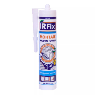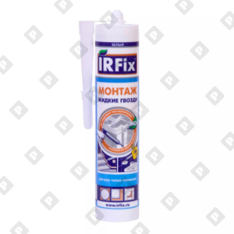 Жидкие гвозди IRFix МОНТАЖ предназначены для работы с любыми видами декоративных изделий из полиуретана, полистирола (в том числе для приклеивания белых потолочных плиток), камня, кафеля, гипса, дерева эксплуатируемых во влажных и сухих помещениях. Время недопустимого контакта с водой после нанесения клея - 24 часа. После высыхания поверхность можно окрашивать.